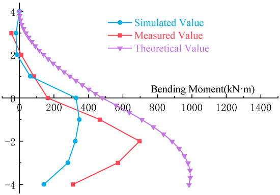 The simulated value, measured value, and theoretical value of the bending moment of the subordinate anti-skid pile are compared, as shown in Figure 15.
