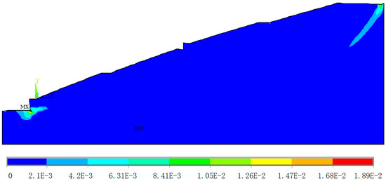 The results of the numerical analysis suggest that the recommended length for the upper anti-sliding piles is 15 m, and, for the lower ones, it is 11 m. When the length of the upper pile is set to 15 m, and the lower pile to 11 m, with the other parameters unchanged, the slope’s safety factor is calculated using the strength reduction method. The software calculations indicate that, when the safety factor of the slope reaches 1.45, the software calculations do not converge. The plastic strain contour of the slope is illustrated in Figure 20. From Figure 20, it can be observed that the plastic strain in the slope does not fully penetrate; moreover, only the localized plastic strain is significant, leading to non-convergence in the calculation. This indicates that the safety factor of the slope is ≥1.45, ensuring the stability and reliability of the slope [38].
