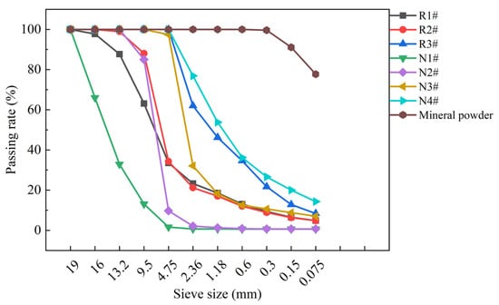 Following the standard test methods of bitumen and bituminous mixtures for highway engineering and technical specifications for highway asphalt pavement recycling [,], the recycled material was crushed and screened to obtain gradation and reduce variability. Asphalt was also extracted from the recycled material. The RAP used in the experiment was categorized into three grades, denoted as R1#, R2#, and R3#. The gradation and asphalt content of each grade of RAP after extraction are shown in Figure 1 and Table 1, respectively. The properties of the virgin and recycled asphalt are represented in Table 2. The new aggregate used is limestone, categorized into four grades denoted as N1#, N2#, N3#, and N4#. The gradation of the new aggregate and mineral powder is illustrated in Figure 1, while the densities of the new aggregate, old aggregate, and mineral powder are provided in Table 3.