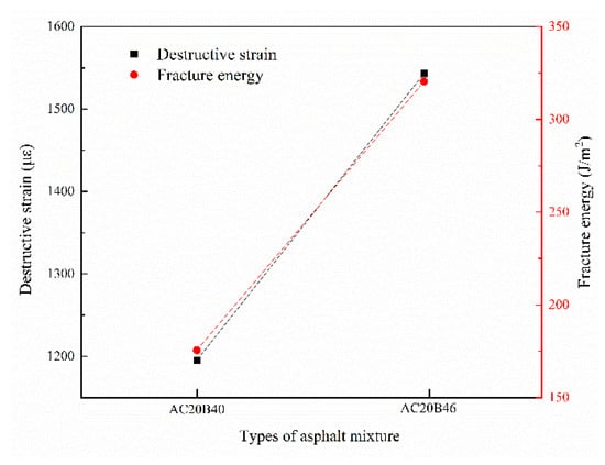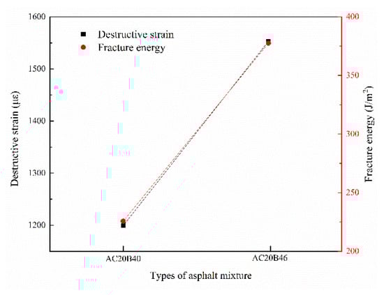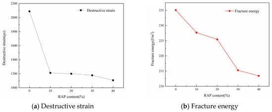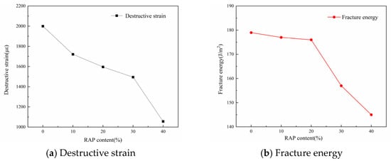 The destructive strain and fracture energy of recycled asphalt mixtures with different RAP contents are shown in Figure 2.