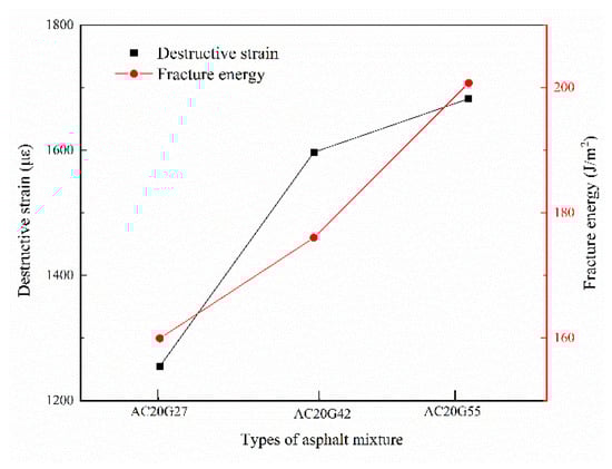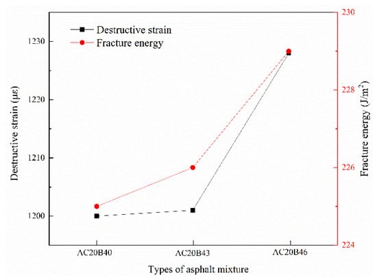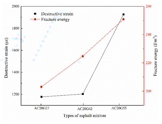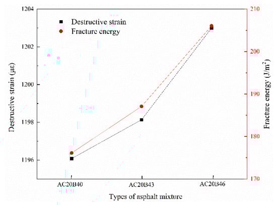 Improving the low-temperature cracking resistance of recycled asphalt mixtures by adjusting the gradation of the mixture is the most desirable way, which will not increase the production process or the production cost. Guo et al. [] found that increasing the passage rate of 4.75 mm sieve holes in the gradation not only reduces the variability of high-temperature performance of recycled asphalt mixtures, but also improves their low-temperature cracking resistance. In this paper, three gradings with different 4.75 mm sieve passages were designed. The maximum nominal particle size of all three gradings was 19 mm, and the gradation curves were close to the upper, middle, and lower limits of the specification, respectively, to test their low-temperature cracking and splitting resistance properties. Figure 8 shows the destructive strain and fracture energy of the grades with different 4.75 mm sieve passage rates.