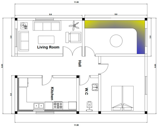 To validate the proposed TRNSYS tool, we compared our model’s results with those from the study conducted by Gounni et al. [29]. We used the same literature databases, assumptions, and modeling conditions for this comparison. Figure 1 depicts the floor plan of the apartment.