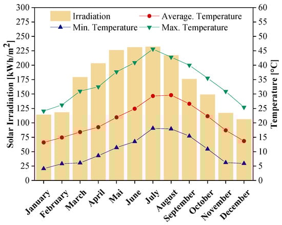 In Figure 2, the evaluation of ambient temperature and incident global radiation intensity on a horizontal plane is presented, utilizing data sourced from the METEONORM database for a typical meteorological year. Notably, this climate zone experiences its highest temperature and radiation levels during July, signifying it as the peak of the year’s heat. Conversely, December, January, and February emerge as the coldest months, with low levels of sun radiation.