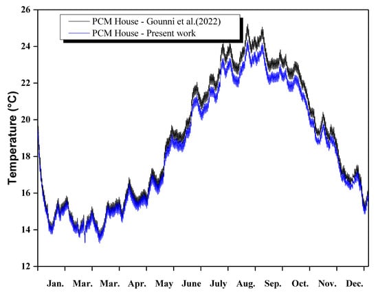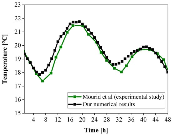 The validations conducted demonstrate the accuracy and reliability of our TRNSYS-based numerical model. The comparison with the numerical results from Gounni et al. [29] shows excellent agreement, with a mean relative error below 0.32%, while the experimental validation based on Mourid et al. [38] yields relative errors between 1.21% and 3.75%. These results confirm the robustness of our model for accurately simulating the thermal behavior of buildings.