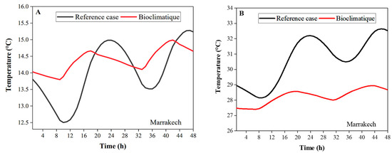 The results indicate that our bioclimatic configuration has significant potential for practical application. Figure 7A,B show temperature estimates for the winter and summer seasons, respectively. The bioclimatic building shows notable benefits in summer, with indoor air temperatures reduced by 2 °C to 5 °C compared to the reference building.