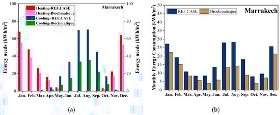 Figure 8a shows the monthly heating and cooling demands for a bioclimatic building and a reference building. The comparison of heating and cooling needs for both buildings shows that the bioclimatic building requires less energy for heating and cooling compared to the reference building in all months of the year.