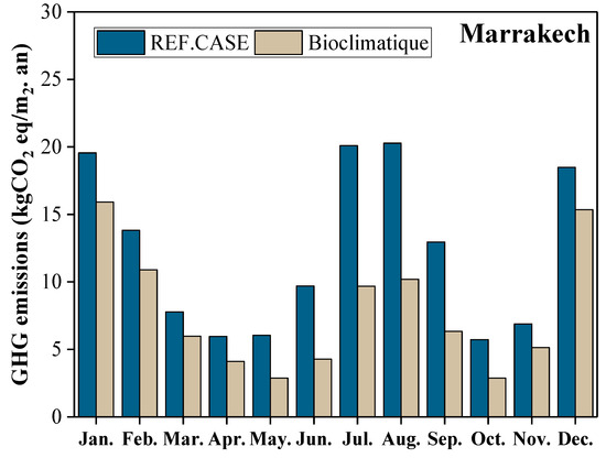 Figure 9 illustrates the calculated GHG emissions for both the reference case and the bioclimatic building in Marrakech. The results show that the bioclimatic building achieved a significant net reduction of 36% in emissions compared to the reference case. This reduction can be attributed to the superior thermal performance of bioclimatic buildings, which enables them to emit less CO2 than conventional buildings.