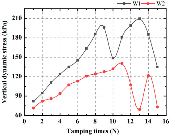 - Dynamic compaction has been demonstrated to be an effective method for reinforcing HGL subgrade. The dynamic stress waveform generated by DC was primarily manifested in shock stress waveforms and vibration damping waveforms. A more pronounced transverse effect was observed in HGL subgrade.