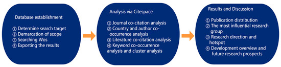 This study analyzes the literature in the database using bibliometric methods and CiteSpace 6.2.R4. CiteSpace employs a normalized matrix for mapping displays using the default cosine algorithm. CiteSpace facilitates the analysis of the collaboration networks among countries, research institutions, and authors, where the size of nodes indicates the volume of publications and their importance, and the color or thickness of the edges represents the strength or frequency of collaborations. The co-citation analysis feature is used to analyze the frequency and connections of cited literature. Keyword co-occurrence analysis reveals high-frequency keywords and their relationships, while intermediary centrality analysis shows changes in research hotspots. Timeline analysis and burst detection are used to display research dynamics and cutting-edge topics. Overall, using bibliometric methods and CiteSpace is suitable for analyzing the current status and development trends of energy-saving potential in solar photovoltaic roofs. The research methodology employed in this study using CiteSpace software is detailed in the workflow shown in Figure 1.