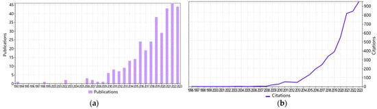 Annual trend in the number of relevant files. Note: Statistics are up to December 2023. (a) Number of annual publications; (b) Frequency of citations to annual publications from 1993 to 2023.