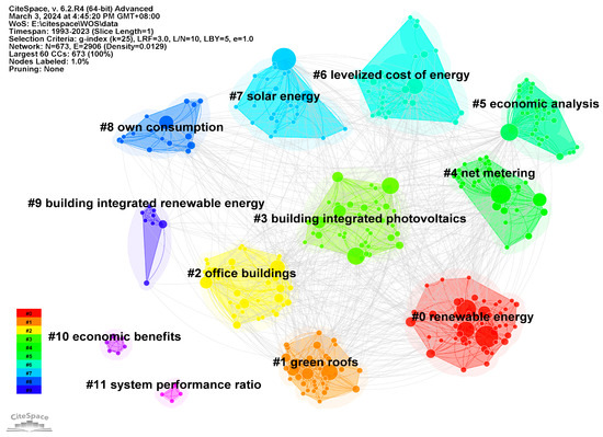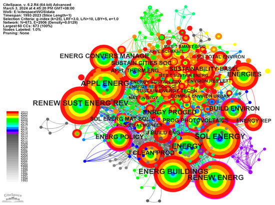 By running the co-citation publication analysis function in CiteSpace, we can observe the distribution of publications related to solar photovoltaic roofs from 1993 to 2023, as shown in Figure 3. The publication network comprises 673 nodes and 2906 links, with an overall density of 0.0129, indicating close connections between nodes. Journals such as Solar Energy, Applied Energy, and Renewable Energy have larger node diameters and contain more colors, signifying their long-term influence in the field of energy consumption related to solar photovoltaic roofs. Journals like Sustainable Cities and Society and Applied Thermal Engineering have smaller node diameters, but their outer rings are red, indicating a rapid increase in the number of articles published in these areas in recent years. From these results, it is evident that articles related to solar photovoltaic roofs are frequently published in journals closely associated with energy and sustainable development, aligning with the current global energy shortage and the intensive development of energy-efficient buildings.