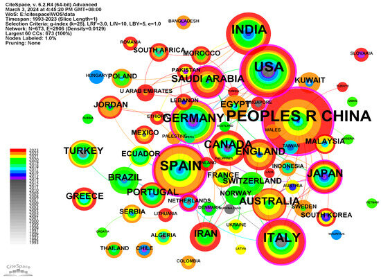 By analyzing the academic output of various countries, it is possible to determine which nations have significant influence and contributions in the field related to solar photovoltaic energy. Using CiteSpace to construct a country-region collaboration network from the 333 articles in the database revealed a network with 71 nodes and 98 links, with a network density of 0.0394, as shown in Figure 4. The larger the node of each country, the more publications that country has in the relevant field. The color of the links between nodes represents the time when two countries first collaborated, with warmer colors indicating more recent collaborations. Most countries have established collaborations between 2021 and 2023, indicating recent formations of these partnerships. Germany and Italy, as well as the USA and Spain, have established earlier and closer relationships. Countries like China, India, and Arab nations, although starting their research later, have larger node diameters and a ring color close to red, indicating that these countries have recently been actively conducting research in solar photovoltaics and have published a significant number of findings.
