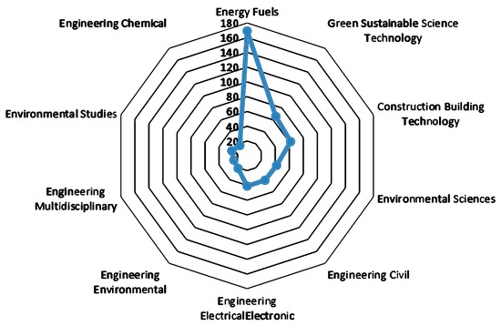 According to the subject classification in the Web of Science database, over the past 30 years, research related to energy-saving solar photovoltaic roofs has encompassed 62 different academic disciplines [19]. The top 10 disciplines by publication volume are shown in Figure 5. Energy fuels, green sustainable science, and construction building technology dominate this field. The energy fuels discipline has published the most papers, totaling 177, as solar photovoltaic roofs convert sunlight into electrical energy through solar panels. This application in the energy sector involves energy production, transformation, and utilization, which aligns closely with the focus of energy fuels on energy extraction, transformation, utilization, and the study and application of related technologies. Solar photovoltaic roofs are a clean energy technology that does not produce greenhouse gases like carbon dioxide, making them environmentally friendly; thus, publications in the green sustainable science discipline rank second. Moreover, solar photovoltaic panels on roofs need to be integrated into the building structure; hence, the design, installation, and maintenance of solar photovoltaic roofs involve technical issues related to building materials, structural design, and construction processes, making the construction building technology discipline significantly impactful. This demonstrates that as technology advances and societal demands for sustainable development grow, solar photovoltaic roof technology holds tremendous potential in the energy, environmental, and architectural sectors, necessitating further exploration by people.