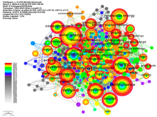 Using CiteSpace’s keyword co-occurrence analysis feature, an analysis was conducted on the database of articles, revealing the research field’s hot topics and future development trends. The keywords “solar photovoltaic roof” and “energy consumption”, used as search terms in setting up the database, were excluded from the analysis. The established keyword co-occurrence network consists of 376 nodes and 1495 links, with a network density of 0.0212, indicating very tight connections between nodes, as shown in Figure 7. After statistical organization, the top 15 keywords by frequency and centrality were identified, as listed in Table 7. According to Figure 7 and Table 7, the keywords “solar energy”, “performance”, “energy”, and “renewable energy” had the highest occurrence frequency, while the top four keywords by centrality were “buildings”, “energy”, “performance”, and “solar energy”, each with a centrality exceeding 0.1. This indicates that research on solar photovoltaic roofs primarily focuses on assessing the performance of photovoltaic systems, including evaluations of power output, economic benefits, and environmental impacts. Secondary research interests include the performance of photovoltaic components, particularly their thermal, lighting, and power generation capabilities. Lastly, the feasibility studies of photovoltaic installations, such as simulations of solar radiation on building facades, power generation, and installation potential, are also prominent areas of research.