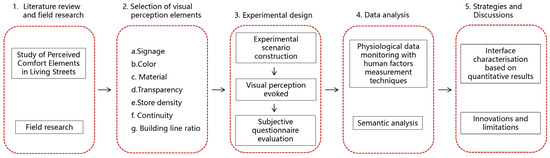 In order to ascertain the magnitude range of four visual elements that engender a sense of comfort, namely transparency, store density, color, and material, this study adopts the method of building an experimental street scene model to adjust the different quantitative values of a single element while ensuring the consistency of other elements. At the same time, the physiological signals of the subjects during the experiment were recorded by the wearable physiological sensor, and then coupled with the subjective questionnaire results for translation analysis. Following the presentation of visual stimuli comprising interface elements with varying values, individuals will experience corresponding perceptual alterations. The measurement of physiological signals represents an objective indicator of these perceptual changes [49]. Many scholars have conducted relevant studies on the use of physiological signals to reflect people’s perceptual changes. Among them, heart rate variability (HRV) is often used to evaluate participants’ emotional changes and perceptual conditions [50,51,52,53,54], and electrodermal response is also a physiological signal greatly affected by emotional changes [55,56,57]. Therefore, in this study, two kinds of data, photoplethysmography (PPG) and electrodermal activity (EDA), were collected and translated into heart rate variability (HRV) and skin conductance (SC) to analyze the perceived comfort of subjects. With regard to the interface elements that are challenging to quantify, this paper also examines and discusses them through semantic analysis, integrates the measurement outcomes of diverse elements, and outlines the characteristics of the visual elements of living streets that engender a sense of comfort, thereby furnishing a basis for the design and assessment of street space (Figure 1).