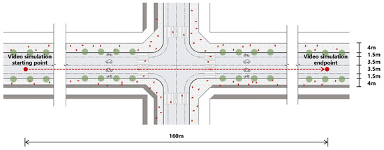 A summary of the characteristics of the streets in the previous field investigation revealed that the interface transparency of existing living streets is distributed across a range of approximately 20% to 70%. Four distinct types of interface were identified in the streets, with type 1 and type 2 representing the most prevalent. In accordance with the findings of the preceding design experience and research, the minimum value of interface transparency in this experiment was set at 20%, and the transparency of the remaining control groups was increased in a stepwise manner on this basis. In order to ensure the uniformity of transparency changes and the visibility of the human eyes when changes are made, the change gradient of the control group was set at 20%. The values were set at N1 = 20%, N2 = 40%, N3 = 60%, and N4 = 80%. To ensure that the sole variable under examination was interface transparency, and to circumvent any potential interference from environmental noise, traffic flow, and architectural forms, this experiment constructed a street interface model to simulate the street interface with different transparency levels. The model was constructed with a common living street, comprising two lanes in the middle and non-motorized lanes and sidewalks on either side, serving as the basic experimental scene (Figure 3). The style of the building interface along the street was characterized by a simple modern aesthetic, with grey granite as the primary material. The color scheme was restrained, and the signage and decorations of the stores were simplified and consistent wherever possible. The store names were also kept to a minimum to avoid distracting the subjects (Figure 4). In this experiment, the total length of the interface was approximately 160 meters, an intersection was established at 80 meters to disconnect, and the remainder of the interface was continuous. Furthermore, the interface of the building along the street was guaranteed to be in the same horizontal plane. The density of storefronts along the street remained consistent across the four transparency scenarios, with a value of 15/100 m (Table 2). A fixed-motion route was established within the model to simulate the initial perspective of pedestrians traversing the street, and a video was subsequently created. The subjects were presented with video footage of street scenes with varying degrees of transparency in the interface and subsequently completed the experiment.