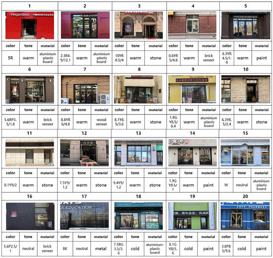 In the construction of living street space, the color and decorative material of the interface are significant factors influencing people’s visual perception [19]. Following preliminary field research, the colors and materials that were observed to occur with the greatest frequency in the street interface were extracted. The extracted representative colors were then matched with color samples from the Chinese Architectural Color Card. The most prevalent street interface colors and materials are illustrated in Figure 7. The 20 selected representative colors have been divided according to tone. The proportion of warm tones is significant, followed by neutral tones, with cold tones being the least common. The interface materials are diverse and include paint, stone, wood veneer, and metal plate, among others. In the context of street interface design, there is a notable interplay between the selected materials and colors. The style and characteristics of two different materials with the same color are not identical, and the inherent characteristics of the materials in question impose certain limitations on the color tendencies that can be exhibited.