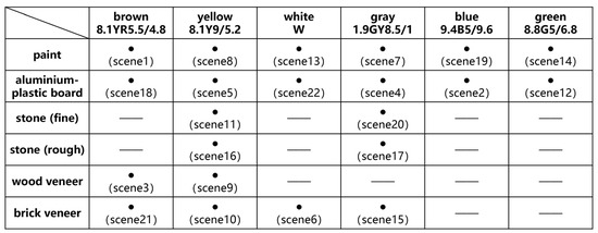 This experiment on the perception measurement of interface color and material is based on the mutual influence of color and material. It uses a cross-combination of color and material to build a variety of street interface models. In accordance with the findings of the preceding research, this experiment selected two colors per tone from the three shades of warm tones, cool tones and neutral tones, resulting in a total of six typical colors. Additionally, six common interface materials were selected, namely paint, aluminum-plastic board, brick veneer, wood veneer, and two kinds of stone, which were recorded as stone (rough) and stone (fine) according to their respective degrees of smoothness. Following the cross-combination of the six colors and six materials, some unsuitable scenes were eliminated based on the colors presented by the materials. This process yielded 22 street interface colors and material scenes. To prevent the repetition of identical color combinations, the 22 scenes were randomly assigned numerical identifiers following the disruption process. The characteristics and numbers of the experimental scenes are presented in Figure 8.