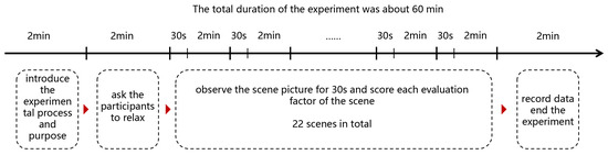 Prior to the commencement of the experiment, the experimental procedure and rating criteria were fully elucidated to the participants. During the experiment, the environment was maintained in a quiet and interference-free state. Participants were instructed to observe each scene for 30 s and then score the evaluation factors for 2 min immediately after each observation. This procedure was used to ensure the timeliness and accuracy of the participants’ perceptions (Figure 9).