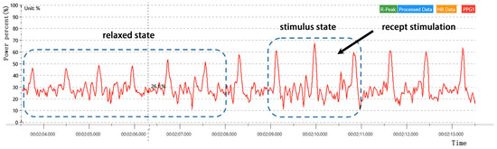 Following the translation of PPG signals, HRV data can be obtained, comprising a high-frequency component (HF), a low-frequency component (LF) and a balance ratio (LF/HF) of HRV (Figure 10). The HF reflects the activity of the parasympathetic nerves, while the LF reflects the activity of the sympathetic nerves. The LF/HF can be used to reflect the antagonism of sympathetic and parasympathetic nerves, which should be in a weak state when an individual is in a comfortable state; it is therefore recommended that attention be paid to the interface value when LF/HF is low when judging perceived comfort [58,59]. It should be noted that due to the individual differences of subjects, the cardinality values and variation values of different subjects were very different; therefore, it was necessary to normalize the data and scale all the data to 0–1.