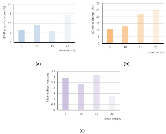 Store density can be quantified by the number of store entrances and exits per 100 m in the street [46], which can serve as a proxy for the compact degree of stores on the street. An excessively high density will inevitably result in a chaotic and unclean street interface, while a deficiency in density will lead to a desolate and insecure atmosphere, ultimately impeding the vitality of the street.