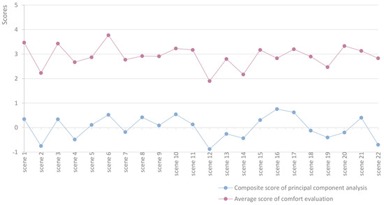 In the process of validating the evaluation criteria, the principal component analysis method was used to reduce the five factors pertaining to color and material into two dimensions. Component 1 comprised three factors: intimacy, pleasure, and tone; and component 2 comprised two factors: roughness and pattern. The comprehensive score for the scene was calculated according to the contribution rates of these two components. The comprehensive score was calculated as follows: 43.448/73.414 × Component 1 score + 29.966/73.414 × Component 2 score. Meanwhile, the comfort degree of 22 scenarios was sorted according to the average score of the sixth comfort factor, as illustrated in Figure 14. The two calculation methods yielded comparable results in terms of the change trend of the perceived comfort score of each scenario. The scenarios with the highest scores under the two calculation methods are primarily concentrated in scenarios 1, 3, 6, 10, and 17. In contrast, the scenarios with the lowest scores are 2, 4, 12, 14, and 19.