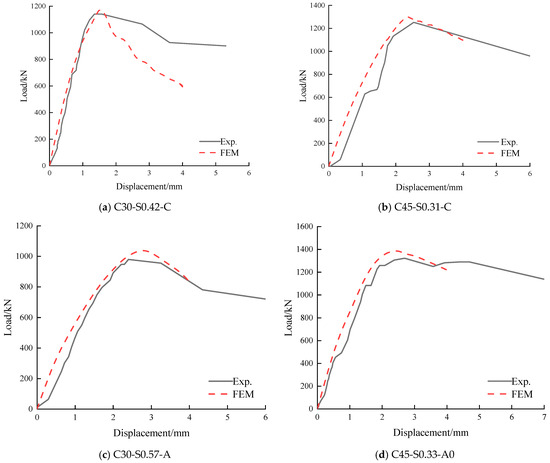 Since softening damage is involved, the crack band theory [23] is often utilized to manage crack propagation and post-peak compression behavior, thereby avoiding mesh sensitivity arising from strain localization [24,25]. In the crack band theory, softening damage is assumed to exist within a band area of finite width. In the finite element model, the crack zone width is equal to the element size. During modeling, the element size must be adjusted to ensure that the area under the stress–strain curve equals the material’s fracture energy divided by the crack width. For different element sizes, the stress–strain relationship needs to be readjusted accordingly. To simplify the application of complex material models, the model can be calibrated using predefined model parameters and element size, with the cell size remaining unchanged in subsequent simulations [26,27]. The embedding method is employed to simulate the bond between concrete and reinforcement, assuming a perfect bond. This assumption of perfect bonding between reinforcement and concrete in finite element analysis is a modeling simplification that increases the stiffness of the load–displacement response without significantly affecting the failure mechanism and ultimate capacity of the model. In practical engineering, this assumption is justified when anchorage failure is not the dominant mode of test failure, as reinforcement slippage is limited [28]. Given that no anchorage or pull-out failure of reinforcement occurred in the tests, the assumption of a perfect reinforcement connection is viable.