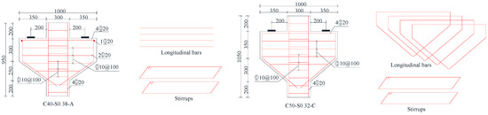 This study was designed to examine how variations in these parameters influence the accuracy and safety of codes at a constant design load capacity. In accordance with Chinese and American codes, 22 corbel specimens were systematically designed to support a target load of 750 kN for a single corbel. Concrete strength grades ranged from 30 MPa to 70 MPa, and shear spans varied from 100 mm to 300 mm, incremented at 50 mm. For the American code corbels, the height varied from 400 mm to 600 mm, while for the Chinese code corbels, the height ranged from 550 mm to 725 mm. All specimens had a width of 300 mm and a concrete protective layer thickness of 20 mm. The pad plate dimension was 150 mm. Specimens with shear spans of 100, 150, and 200 mm had a cantilever length of 350 mm, while those with shear spans of 250 and 300 mm had cantilever lengths of 400 mm and 450 mm, respectively. The longitudinal reinforcement and stirrups had diameters of 20 mm and 10 mm, respectively, with a stirrup spacing of 100 mm. All provided stirrups were horizontal. The yield strengths for the longitudinal reinforcement and stirrups were 425 MPa and 478 MPa, respectively, and their tensile strengths were 615 MPa and 613 MPa, based on material performance tests referenced [29]. To ensure computational equivalence under the same design load, the model distributes the calculated area of longitudinal reinforcement evenly among four longitudinal bars; however, this results in a discrepancy between the modeled steel area and that of an actual bar with a 20 mm diameter. Design specifications are detailed in Table 2. Specimen numbering is composed of three parts: the first indicates the concrete cylinder’s compressive strength, the second represents the shear span ratio, and the third identifies the design codes, with “C” for the Chinese code and “A” for the American code. Figure 5 presents a schematic representation of the reinforcement configuration for typical corbels, where analogous reinforcement details are applied to the remaining corbel specimens in this study.