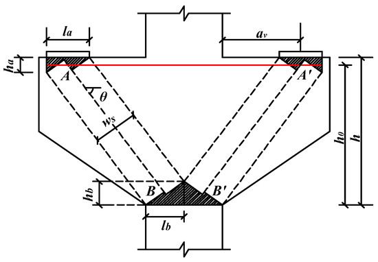 As shown in Figure 7, the model consists of CCT (two-sided compression and one-side tension) nodal regions A, A’, CCC (three-sided compression) nodal regions B, B’, concrete compression struts AB, A’B’, and steel ties AA’. The width of the CCT nodal region la is the width of the supporting plate, and the height ha is twice the distance from the concrete edge to the center of the longitudinal reinforcement. The width lb of the CCC nodal region is taken as half of the column width [15], and the height hb is taken as the equivalent height of the compressed zone, denoted by β1c.