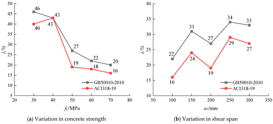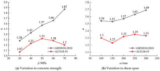 Higher values of α denote a greater safety margin for the component, whereas lower values suggest a reduced safety margin. The calculated results for α are detailed in Table 2. Figure 8 demonstrates the impact of variations in concrete compressive strength and shear span on the safety margin of corbels, as designed by methods outlined in the Chinese and American codes.