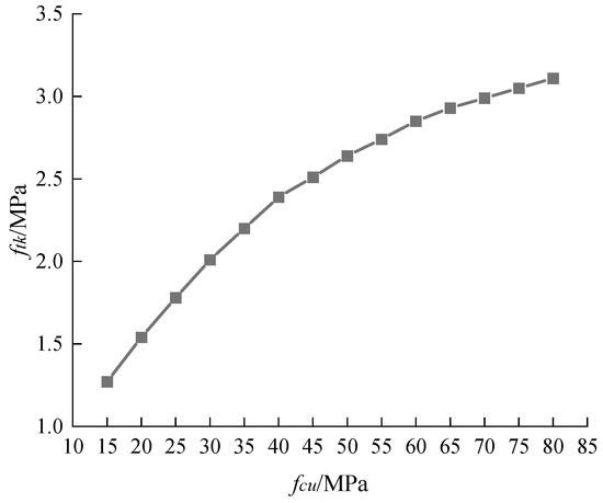In Table 2, the nine specimens whose specimen numbers end with C are corbels designed according to the Chinese code. Since the compressive strength of the cylinder is selected in the component’s design, the conversion relationship between the compressive strength of the cylinder and the cube is such that the compressive strength of the cube is 1.25 times that of the cylinder. The value of ftk can be obtained by linear interpolation against the code table, based on the compressive strength of the cube.