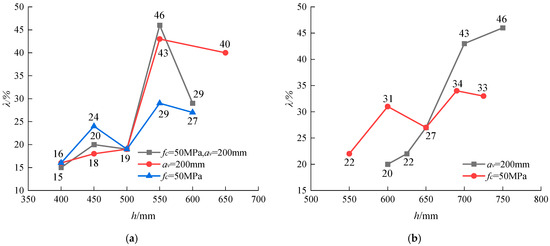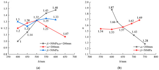 Figure 10 illustrates the impact of height variation on the safety margins of corbels designed according to Chinese and American codes. For designs adhering to the American code, Figure 10a presents three sets of data. In the first set, with the concrete strength consistently maintained at 50 MPa and a shear span of 200 mm, it can be observed that as the corbel height increases, the required area of longitudinal reinforcement decreases, leading to an increasing trend in safety margin. This margin increases from 1.0 at a height of 400 mm to 1.48 at 600 mm. The second set of data involves a constant shear span with the concrete strength reduced from 70 MPa to 30 MPa. The safety margin peaks at 1.32 at a height of 500 mm, then exhibits a declining trend. This suggests that the benefits of an increased section depth on the load-bearing capacity are offset by the reduced reinforcement area and the decrease in concrete strength. The third set of data shows a constant concrete strength with an increase in the selected shear span from 100 mm to 300 mm. As the corbel height increases, the shear-span-to-depth ratio also increases, with no significant change observed in the safety margin. For designs based on the Chinese code, Figure 10b presents two sets of data. In the first set, with the shear span held constant and the concrete strength reduced from 70 MPa to 30 MPa, the safety margin decreases from 1.87 to 1.28 as the corbel height increases. In the second set, with a constant concrete strength, the shear span is adjusted from 100 mm to 300 mm, resulting in an increase in safety margin from 1.54 to 1.69. According to the crack formula specified by the Chinese code, when the corbel width and concrete strength remain constant, the shear span must be adjusted correspondingly, with changes in corbel height to maintain the target load. It is therefore not feasible for both the shear span and concrete strength to remain unchanged simultaneously.
