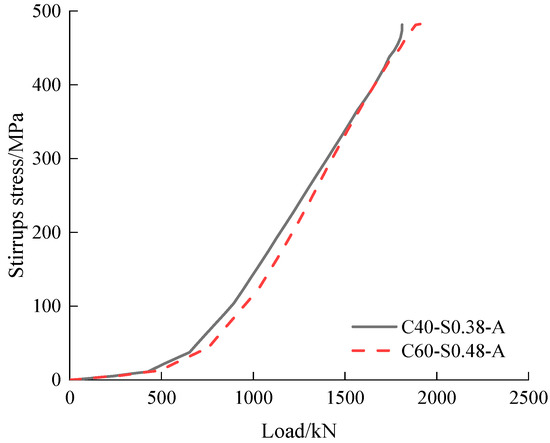 As illustrated in Figure 11, stirrups play a particularly crucial role in increasing the bearing capacity, especially when using low-strength concrete or facing large shear spans. To demonstrate this, specimens C40-S0.38-A and C60-S0.48-A are taken as examples, for which numerical model analysis revealed the change in maximum stress of the first layer of stirrups during loading. Figure 12 shows that under the same load, the stirrup in the low-strength concrete corbel member experiences greater stress, thus more effectively strengthening the structure. This is because in low-strength concrete, the material’s tensile properties are weak, leading the stirrup to play a more significant role in controlling crack development.