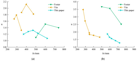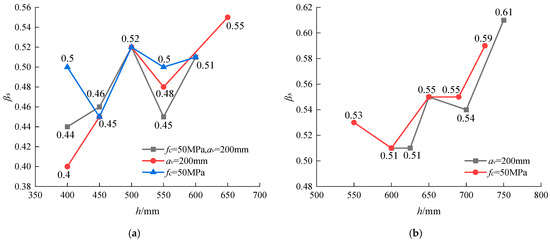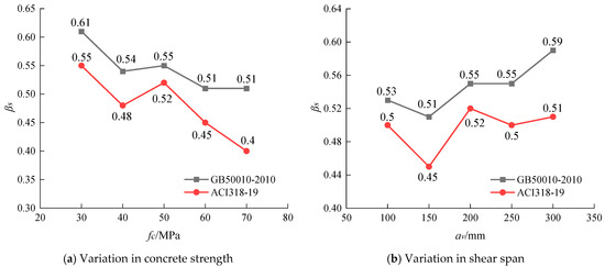 Figure 14 illustrates the variation in the strut coefficient with changes in concrete compressive strength and shear span. Figure 15 shows the variation in the strut coefficient with changes in corbel height. The results indicate that corbel specimens with lower concrete strength or larger shear span ratios or greater corbel heights have a higher strut coefficient. Conversely, in cases of high concrete strength, the strut coefficient is lower, which may lead to unsafe predictions of the structural load-bearing capacity under conditions without stirrups and unyielded longitudinal reinforcement, with the risk of code-calculated results exceeding experimental load-bearing capacities. Therefore, to enhance the accuracy and safety of structural load-bearing capacity predictions, the value of the strut coefficient βs should be determined considering a broader range of design parameters.