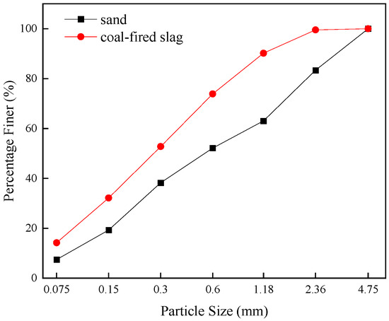 In this study, P-O42.5 cement from the Xinjiang Shihezi Nanshan Cement Plant was used. Table 1 displays the properties of the cement, which meet the physical, mechanical, and chemical standards outlined in the Chinese national standard GB175-2007 [27]. The fly ash used in this study was from Xinjiang Yue Longda Renewable Resources Technology Co., Ltd. (Shihezi, China). The parameters of fly ash are listed in Table 2. The aggregates used were as follows: (1) sand: river sand with a fineness modulus of 2.84, classified as medium sand, and a water content of 5.7%; (2) coal-fired slag: preliminary crushed slag from the Shihezi South Thermal Power Station, with a particle size of less than 5 mm, a bulk density of 834 kg·m−3, and a water content of 5.4%; (3) stones: pebbles with a particle size in the range of 5–20 mm and a water content of 2.3%. The particle size distribution of coal-fired slag and sand is presented in Figure 1. The chemical composition of the slag is detailed in Table 3. The water-reducing agent used was HSC polycarboxylic acid with a water-reducing rate of 15 wt%, and the test water was municipal tap water.