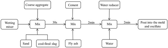 The process for preparing the concrete is depicted in Figure 2. To prepare the concrete, the mixer was first wetted. Next, the weighted stones, sand, and slag were added and mixed for 30 s. Then, cement and fly ash were added, and the mixture was blended for 2 min. Finally, water and the water-reducing agent were added, followed by another 2 min of mixing to ensure uniform mixing of the concrete. The concrete was poured into molds to create 100 mm × 100 mm × 100 mm and 150 mm × 150 mm × 300 mm test blocks. After molding, the specimens were placed in a standard curing box set to a temperature of 20 ± 1 °C at a relative humidity of 90 ± 5%. The specimens were cured in this environment for 28 d.
