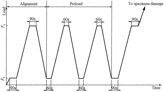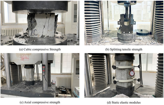 The workability of the concrete was evaluated according to GB/T 50080-2016, “Standard of Test Methods for Properties of Ordinary Concrete Mixes” [29]. The cubic compressive strength, splitting tensile strength, axial compressive strength, and static modulus of elasticity were tested according to GB/T 50081-2019, “Standard of Test Methods for Physical and Mechanical Properties of Concrete” [30]. To measure the cubic compressive strength and splitting tensile strength of the concrete, three cube specimens of dimensions 100 mm × 100 mm × 100 mm were prepared. Similarly, to measure the axial compressive strength and static modulus of elasticity of the concrete, three cube specimens of dimensions 150 mm × 150 mm × 300 mm were prepared. The arithmetic mean of the test values of the three specimens was considered the strength value of the final specimen. If the difference between the maximum or minimum test value and median value exceeded 15% of the median value, the maximum and minimum test values were excluded and the median value was used as the test result. Because of the use of nonstandard specimens for testing, the values of the cube compressive and split tensile strengths were multiplied by a size-conversion factor. The dimensional conversion factor was 0.95 for the former and 0.85 for the latter. The loading rates of cube compressive strength, axial compressive strength, and static modulus of elasticity test should be between 0.5 and 0.8 MPa/s, and the split tensile strength loading speed should be between 0.05 and 0.08 MPa/s. The loading method is illustrated in Figure 3. A schematic of the elastic loading method is shown in Figure 4. A scanning electron microscope (SEM; ZEISS Gemini, Oberkochen, Germany) was used to study the microinterfaces, providing a detailed analysis and characterization of the concrete sample interfaces and valuable insights into their microstructural properties. Additionally, the hydration reaction of the SC was investigated using an X-ray diffractometer (D8 ADVANCE; Bruker AXS, Karlsruhe, Germany) to examine the physical phases of the hydration products after 7 and 28 d. This sophisticated instrument enabled the comprehensive characterization of the hydration products, supporting the study of the chemical processes within the SC.