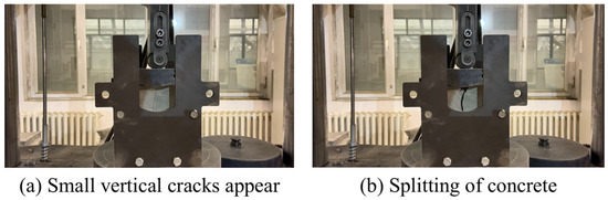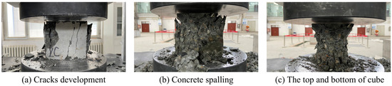 Cubic compressive strength tests were conducted on the concrete to observe the damage evolution and morphology of the SC, which were found to be similar to those of ordinary concrete. At approximately 0.8 times the peak load, small vertical cracks first appeared at the top and bottom edges of the sides of the cube. As the load increased, the cracks widened and extended to the middle of the sides. Upon reaching the peak load, the concrete on the side surface was peeled off, and an “X”-shaped diagonal crack was formed in the middle of the cube at an angle of approximately 45°. The top and bottom of the cube were connected by two prismatic cracks. The damage patterns are shown in Figure 5.