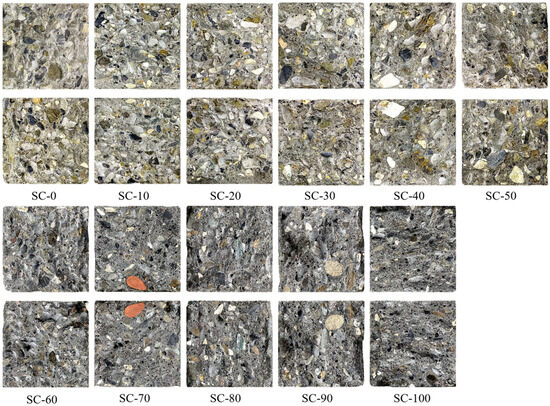 The splitting tensile strength test found that, at approximately 0.95 times the peak load, small vertical cracks first appeared on the side of the test block. As the load continued to increase, these cracks rapidly widened, leading to the splitting of the test block, although the cross-section remained relatively flat. The morphologies of the SC specimens from the splitting tensile strength test are shown in Figure 6. Further observation of the splitting cross-sections of each SC specimen revealed two types of failures: (1) stone fractures and (2) the peeling off of stones from the cement mortar matrix. This indicated that, in some cases, the bond strength between the slag cementitious mortar and the coarse aggregate was higher than the strength of the slag itself. From group SC-6 onwards, holes began to appear in the split cross-sections. As the slag replacement rate increased, both the number and size of these holes increased, suggesting that a high dosage of slag adversely affected the performance of the concrete. The splitting cross-sections of the SC specimens are shown in Figure 7.