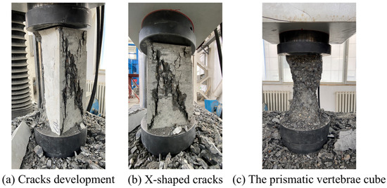 An axial compressive strength test was conducted during the initial loading period. The SC surface did not show obvious cracks as the loading continued, up to 0.75 times the peak load. The middle of the side of the specimen in the direction of the loading, which was vertically parallel to the direction of the crack, continued to be loaded, and cracks developed vertically. As the load continued to increase to 0.9 times the peak load, the specimen side of the diagonal cracks quickly developed through the side surface of the concrete peeling and in the middle of the test block to form “X”-shaped oblique cracks intersecting at a 75° angle, thereby forming the top and bottom of the two top-connected prismatic vertebrae. The damaged surfaces exhibited peeling cracks in the stone and cement mortar matrices. The SC axial compressive strength test patterns are shown in Figure 8.