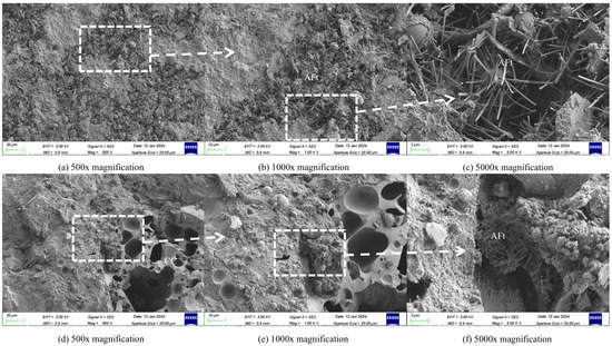 As shown in Figure 9a–c, dense needle- and rod-shaped calcite (AFt) formed in the spaces around the aggregate (S). These formations filled the interstitial spaces between the aggregates, producing a dense concrete paste. Figure 9d reveals micropores of various sizes within the slag (CC) particles visible on the ruptured surfaces. These micropores absorbed a significant amount of water during mixing, which reduced the workability of the concrete. In addition, the presence of micropores decreased the solidity of the slag, adversely affecting the strength of the concrete. Figure 9e,f show that needle- and rod-like calcite (AFt) and cluster-like hydrated calcium silicate (C–S–H) formed around the slag particles. The strength of these hydration products was greater than that of the slag particles. Consequently, the SC rupture surface first appeared on the slag particles under loading and then extended outward, leading to concrete damage.