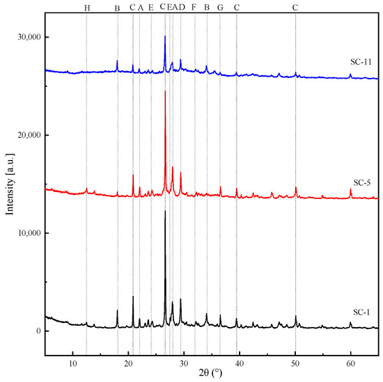 The X-ray diffraction (XRD) test results for the 28-d old SC-1, SC-5, and SC-11 groups are shown in Figure 10. As shown in the figure, the hydration products across all groups, including quartz (SiO2), ettringite (AFt), calcite (CaCO3), calcium hydroxide (Ca(OH)2), and hydrated calcium silicate(C-S-H), were similar. However, the intensities and appearance of the diffraction peaks of certain hydration products differed.