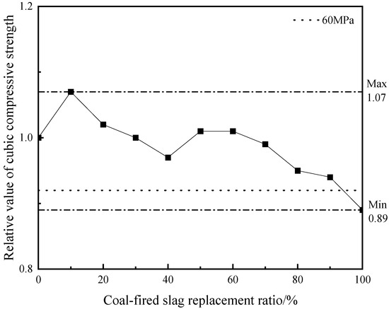 As shown in Figure 11, the SC cubic compressive strength initially increased and then decreased as the slag replacement rate rose, with the overall strength ranging from 89% to 107% of the benchmark. Except for the SC-100 group, all other groups achieved cubic compressive strengths exceeding 60 MPa, comparable to ordinary concrete, demonstrating favorable compressive properties. When the slag replacement rate was below 60%, the cubic compressive strength was comparable to or slightly higher than that of the benchmark group, with the highest strength observed at a 10% substitution rate. Two main factors in these variations in cubic compressive strength are favorable and unfavorable conditions in the cubic compressive strength. First, the slag particles exhibited advantageous water absorption properties, enabling them to store water during the mixing process. This indirectly reduced the water–cement ratio and enhanced the strength of the concrete. During the curing phase, the slag particles continued to absorb and retain water, and the cementitious material was formed on the slag particle surface, which comprised calcium aluminate and hydrated calcium silicate [31]. This improved the structural compactness of the concrete, and the SC cubic compressive strength increased. Second, the slag particles exhibited poor texture, with an unstable and weak structure owing to micropores. Under loading, these particles tended to crush and develop fissures, which compromised the integrity of the concrete and decreased the SC cubic compressive strength. In practice, these conditions have opposing effects. When favorable conditions outweigh unfavorable ones, the SC strength increases. Conversely, when unfavorable conditions dominate, the strength decreases. Analysis of the cubic compressive strength test results indicates that with slag replacement rates below 60%, favorable conditions prevailed. When the replacement rate exceeded 60%, unfavorable conditions became more pronounced, with higher slag replacement rates exacerbating these effects.