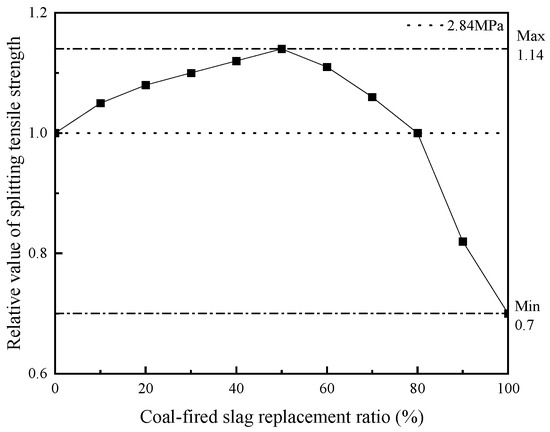 Dimensionless splitting tensile strength of SC as a function of the slag replacement ratio.