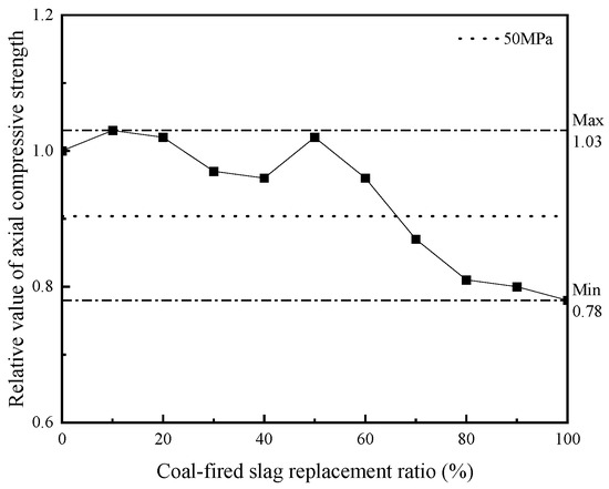 As shown in Figure 13, the axial compressive strength of the SC concrete initially increased with the slag replacement rate but then decreased. The overall rate of change ranged from 78% to 103%. When the slag replacement rate was below 60%, the strength changes were minimal compared to the benchmark group, remaining above 50 MPa. The highest axial compressive strength (57.23 MPa) was observed at a 10% replacement rate. However, when the replacement rate exceeded 50%, the axial compressive strength of the SC concrete gradually decreased.