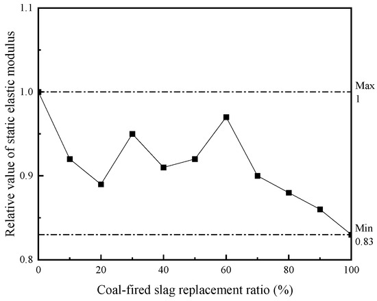 As shown in Figure 14, the normalized static moduli of elasticity values of the SC were less than 1. As the slag replacement rate increased, the values initially decreased, then increased, and subsequently decreased again, exhibiting an overall reduction of 20% or less.