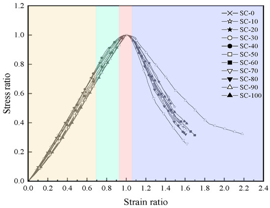 Considering the peak stress and peak strain of the specimen as the reference values, the stress and strain values calculated using Equation (1) were compared to the reference values. The stress ratio was plotted on the vertical coordinate, and the strain ratio on the horizontal coordinate. The dimensionless processing of the specimen stress–strain values enabled the generation of the full curve of the SC dimensionless stress–strain data, which are shown in Figure 15.