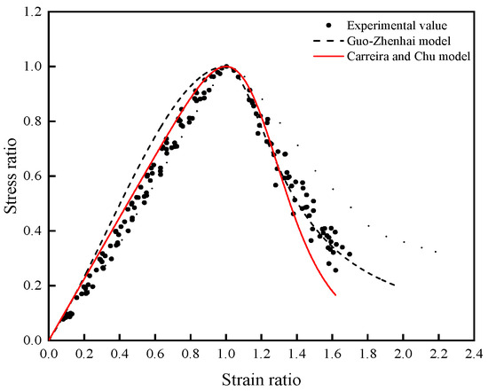 As shown in Figure 16, during the ascending stage, the Carreira and Chu model demonstrated better consistency, with an R2 value of 0.968, while the Guo-Zhenhai model exhibited greater deviation, with an R2 value of 0.7852. In the descending stage, the Guo-Zhenhai model aligned more closely with the Carreira and Chu model, exhibiting an R2 value of 0.9978. Therefore, the equations for the intrinsic SC model were expressed using a segmented approach. Specifically, the Carreira and Chu model was used in the ascending stage, and the Guo-Zhenhai model was used in the descending stage. This approach can be expressed as