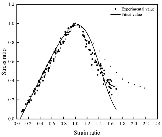 Based on the SC test data, Equation (4) was fitted using OriginPro 2020 (Learning Edition) and the parameters of the stress–strain constitutive equation were obtained as = 5.51, = 1.39, = 0.069, and = −0.223. The fitting results are shown in Figure 17.