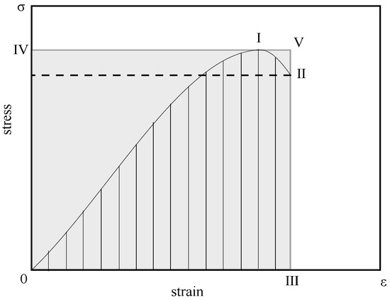 where is the area surrounded by the stress–strain curves and horizontal axis , and is the shaded area of the rectangle surrounded by the peak stress point and ultimate strain point . The stress at the ultimate strain point was 0.85 times the peak stress, as shown in Figure 18.